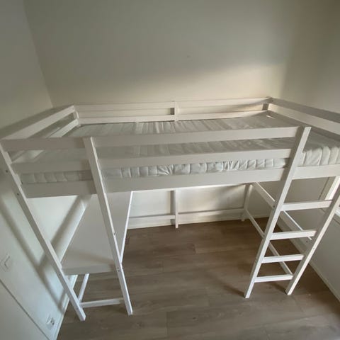 Siistikuntoinen parvisänky. Alapuolella pieni työpöytä. Patjakoko 90x200cm. Linkissä tarkemmat tiedot.