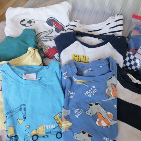- 8 pitkähihaista paitaa; Salama McQueenin ja Spidermanin printit jo hieman kuluneet, mutta oikein passelit vielä seuraavalle supersankarille