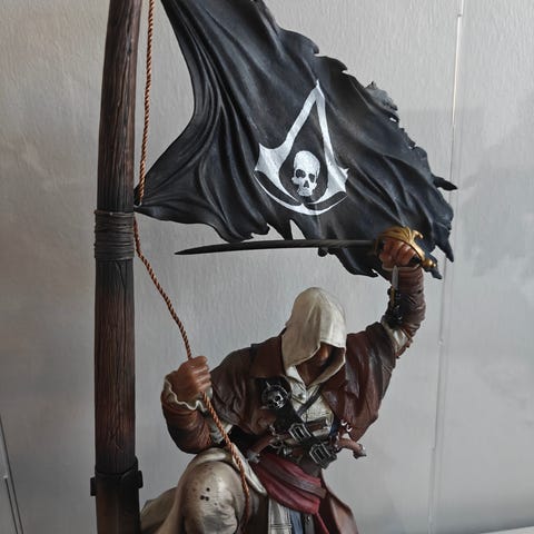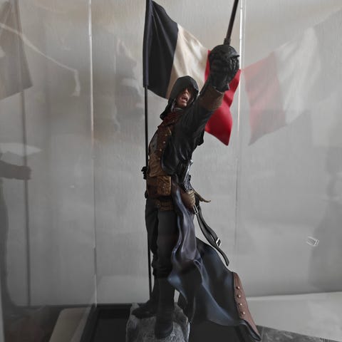Assassin’s Creed 3 Connor -hahmofiguuri, jossa taustalla Yhdysvaltain lippu. Figuuri esittää Connor-hahmoa seisomassa kallion päällä aseiden kanssa. Mukana läpinäkyvä vitriinilaatikko säilytystä ja esillepanoa varten. Sopii keräilyyn ja koristeeksi esimerkiksi hyllylle tai työpöydälle.