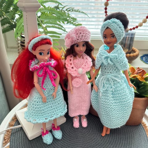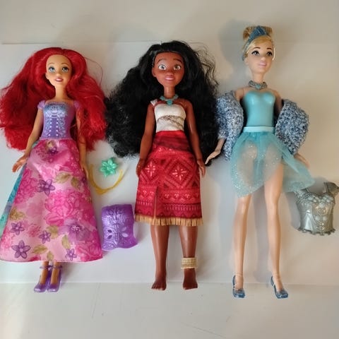 Disney nuket, useita prinsessahahmoja ja merenneito. Setissä on viisi noin nukkea, joilla on muovinen vartalo ja irrotettavat vaatteet. Nukeilla on erilaiset värikkäät mekko- ja hameasut sekä pitkät hiukset. Sopii leikkeihin lapsille, jotka pitävät Disney-hahmoista ja roolileikeistä. Nuket myydään yhdessä kuvien mukaisina vaatteineen.lisä vaatteita halutessa löytyy mukaan
