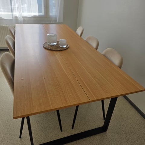 Myydään täyspuinen pohjanmaan kalusteen ruokapöytä sekä 8 tuolia joissa nahkaiset istuinosat