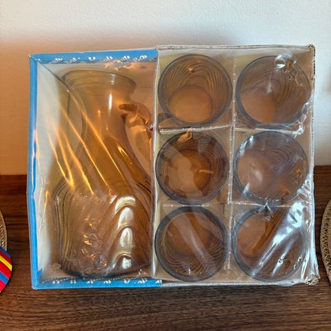 Vintage lasikannu ja juomalasit