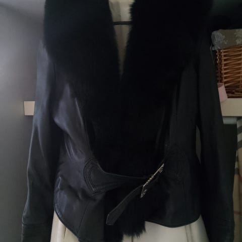 Musta nahkatakki. napit edessä. Pikku kaulukset. Maksu käteinen.