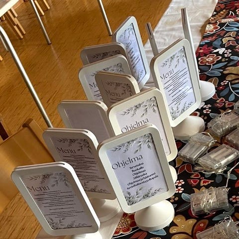 Jysk seinäkoriste, metallinen valokuvakehys. Kehyksessä on useita suorakulmaisia kehyspaikkoja ja pieniä pyykkipoikamaisia klipsejä kuvien tai muistiinpanojen kiinnittämiseen. Väri on kultainen/metallinen ja tuote on tarkoitettu seinälle ripustettavaksi sisätiloihin. Sopii esimerkiksi valokuvien, korttien tai pienten julisteiden esillepanoon. 55x105cm.