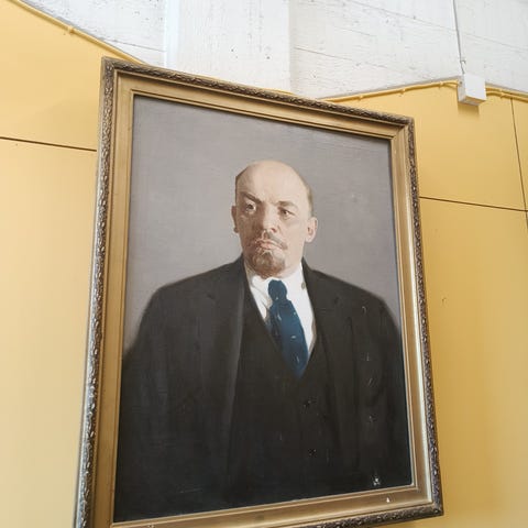Kehystämätön Leninin muotokuva öljyvärimaalaus kankaalle. Koko 60 x 80 cm. Maalauksen takana venäläisen taiteilijan merkintöjä.