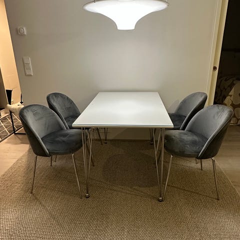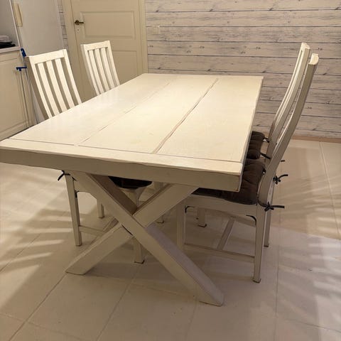 Ruokapöytä ja tuolit sisäkäyttöön. Pöydässä suorakulmainen muoto ja vaalea, lasimainen tai kiiltävä pinta. Pöydän jalat ja runko ovat valkoiset. Tuoleissa on mustat ja valkoiset selkänojat ja istuimet sekä vaaleat jalat. Kokonaisuus soveltuu ruokailutilaan tai keittiöön useamman henkilön istumapaikoiksi.