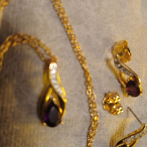 Hopeoitu sydän ketjussa, ja kahdet koukkukiinnityksellä olevat korvakorut. Aurinko-korvikset kultasepänliikkeen valikoimista.