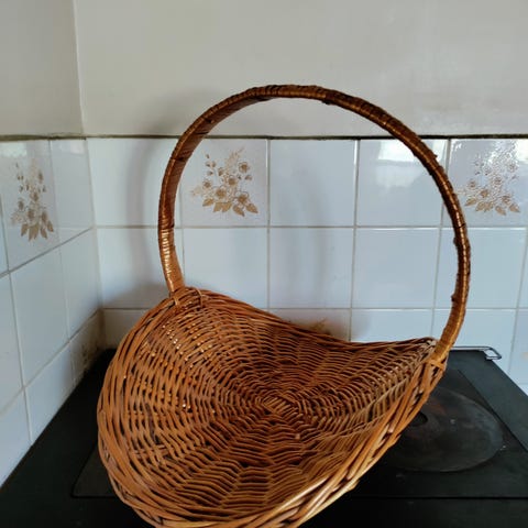 Harmaata punosta. 44cm korkea ja suuaukon halkaisija 39cm. Isommankin käsityön säilytykseen.