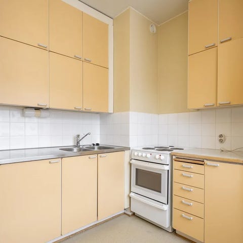 Annetaan remontin tieltä ~ 30v vanha keittiö. Leveys noin 260cm. Kaikki kerralla pois. Ei sis. pienkoneita.
