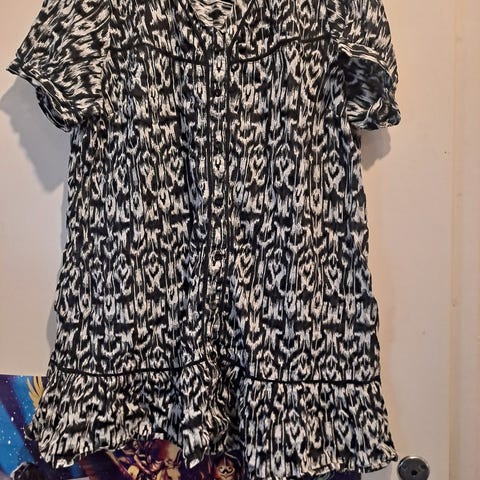 Naisten tunika, koko L. Väriltään keltainen-harmaa, liukuvärjätty tai batikkimainen kuosi. Yläosa on joustava ja rypytetty, helma epäsymmetrinen ja kevyesti röyhelöinen. Lyhyet hihat. Sopii käytettäväksi esimerkiksi arkitunikana tai kevyenä kesävaatteena.