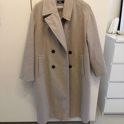 Zaran villakangastakki naisille, koko M. Väri beige. Takissa on kaksirivinen napitus edessä, kauluskäänteet sekä etutaskut.