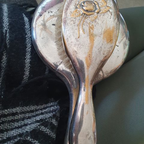 Myydään 1950-luvulta peräisin olevat harjat ja peili. Harjat ovat käyttämättömiä ja siksi kuin uusia vaikka vanhat ovatkin. Peiliä on käytetty ja siksi se näyttää kuluneemmalta. Peili vaatii myös hieman korjausta, taustan koristelevy täytyisi liimata paikoilleen ja kehys on hieman löystynyt. Itse peili on ehjä.