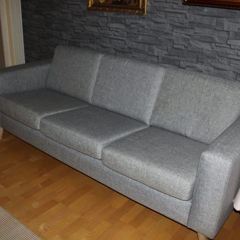 Kolmen istuttava sohva hopean harmaa kangas jossa irrotettavat istuin- ja selkätyynyt. Suorat linjat ja matalat käsinojat. Sopii olohuoneeseen tai muuhun oleskelutilaan istuinryhmän osaksi.