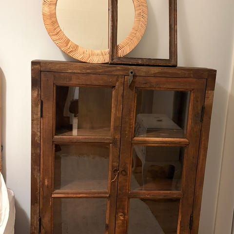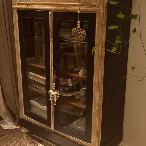 Tilava täyspuinen (akaasia) kaappi. Lattian rajassa hieman haalistumaa. Lasit ehjät ja muutenkin hyvin pidetty.