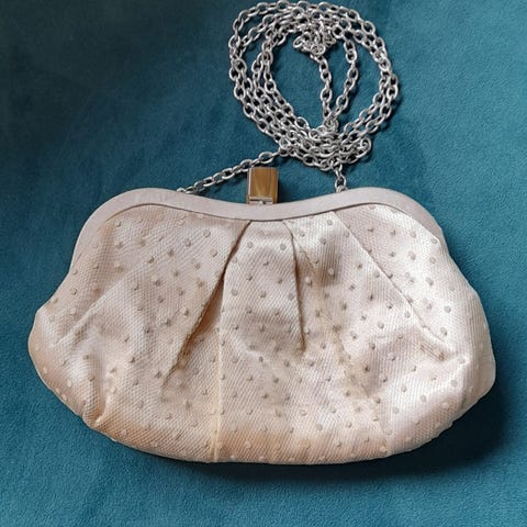 Iltalaukku, tekonahkaa. Hopeansävyinen laukku, jossa on lyhyt kantokahva ja metallinen kehyslukko. Laukun yläreunassa on koristeellinen nauha ja sisäpuolella vuori sekä pieni sisätasku.