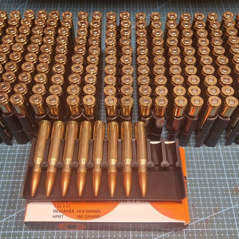 Sakon tarkkuuspatruunaa 390 kpl. Sierra HPBT-luoti 12,3 g / 190 grainia. Näillä alkaa olemaan ikää kohta 20 vuotta ja osassa näissä näkyi nallien reunoilla jonkinlaista härmää / hapettumaa. Tämä on huomioitu hinnassa (vajaa 75 senttiä / kpl). Ryssän peltilaatikko tulee mukaan.