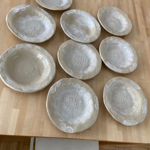 6 kpl soppalautasta josta 1kpl palanen lähtenyt irti. Soppalautaset muutenki kuluneen näköisiä, mutta muuten ehjiä paitsi yhdestä se pala irti.