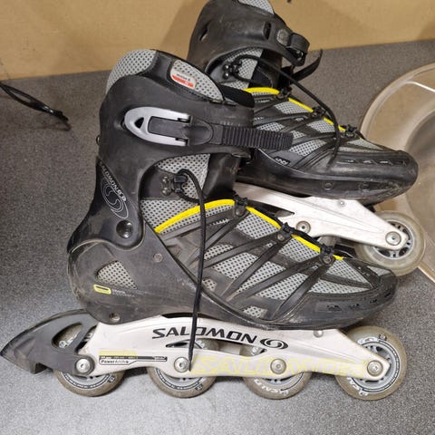 Salomon rullaluistimet, koko 44. Renkaat ovat kuluneet. Muuten hyvässä kunnossa.