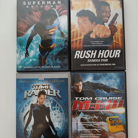 Villit kuviot 1€, Full metal jacket 3€, Ruohonleikkaajamiehen paluu 1€, copy cat 2€, Air force one 3€, Go 1€, Pulp fiction 2€, Dolores Claiborne 5€. 8 MM 1€. Kaikki 15€