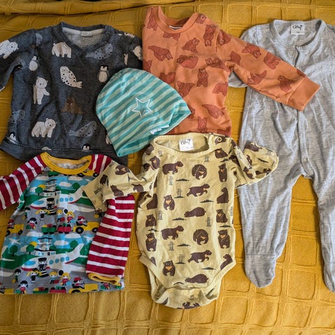 Ehjät, mutta jo paljon käytetyt vaatteet seuraavalle. Pyjama, 3 bodya, housut ja haalari. Käytetty 74/80 koossa.