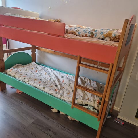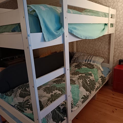 Myydään hyväkuntoinen kerrossänky (pituus 208cm, syvyys 97cm, korkeus 142cm). Sänkyyn sopii 90cm patjat, eivät kuulu pakettiin. Sängyssä joitakin käytönjälkiä, ei ole uudenveroinen enää. Puuttuu osa valkoisista tapeista (kts.kuva).