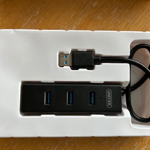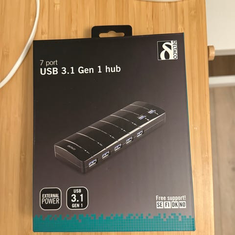 Nedis 5-porttinen USB 3.0 -hubi virtalähteellä. Laitteessa on yksi punainen USB 3.0 -latausportti ja neljä sinistä USB 3.0 -porttia tietoliikennettä varten. Mukana tulee erillinen verkkovirtalähde sekä USB-kaapeli. Rungon materiaalina on alumiini ja väri musta.