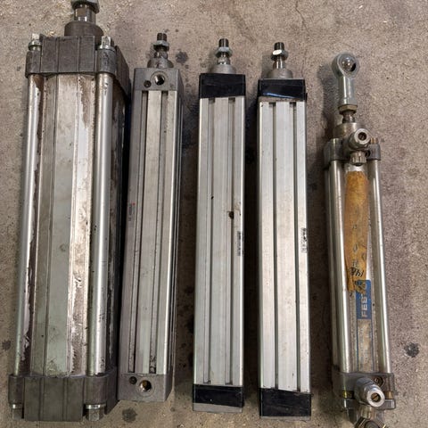 Paineilmasylinterit ja muut pneumatiikan osat. Kokoelma sisältää useita erikokoisia metallisia paineilmasylintereitä, venttiilejä, liittimiä, kiinnitysruuveja ja muita pneumatiikan komponentteja. Osat soveltuvat esimerkiksi paineilmajärjestelmien, koneiden tai laitteiden huoltoon ja rakentamiseen. Materiaalina pääasiassa metalli, mukana sekä pieniä että suuria komponentteja samassa erässä.Hinta alk 5egee kpl.