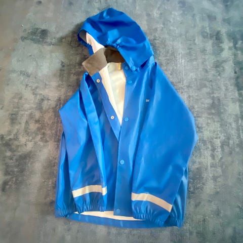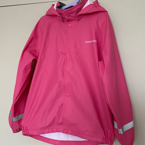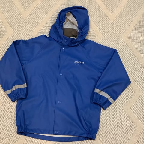 Sininen Didriksons sadetakki, Galon materiaalista. Koko: 130 cm. Nepparikiinnitys, irroitettava huppu ja heijastimet hihoissa. Materiaali on veden- ja tuulen pitävä ja siinä on PFC-vapaa veden hylkivyyskäsittely. Takki on puhdas ja ehjä. Nouto Asola/Rekola tai tarvittaessa Matkahuollon pakettimaksu 6,80€ lisätään.