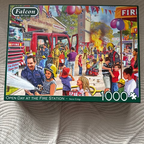 Falcon de luxe Woodland Wildlife -palapeli, jossa on 1000 palaa. Kuvassa on metsäinen maisema ja erilaisia villieläimiä, kuten pöllöjä, peuroja ja mäyriä.
