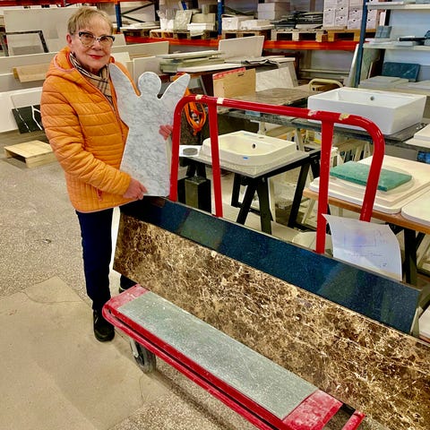 Tahkon kivi, jossa keskellä neliönmuotoinen reikä akselia varten. Mukana metallinen väännin, jossa puinen kahva helpottamassa kiven pyörittämistä käsin. Kivi on paksu ja tasainen, ja sen halkaisija on 410 mm. Vain nouto Vantaalta