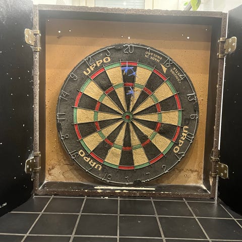 Täysin toimiva taulu. Paljon valmiita pelivaihtoehtoja. Tikkoja, varsia, sulkia ja vaihtokärki mukaan. Toimii paristoilla (3xAA) tai 9V muuntajalla (muuntajaa ei ole). Paristokotelon kansi puuttuu, ei vaikuta taulun toimintaan (Itselläni olen ottanut aina pariston pois paikoiltaan heittelyn jälkeen, niin ei kuluta virtaa).