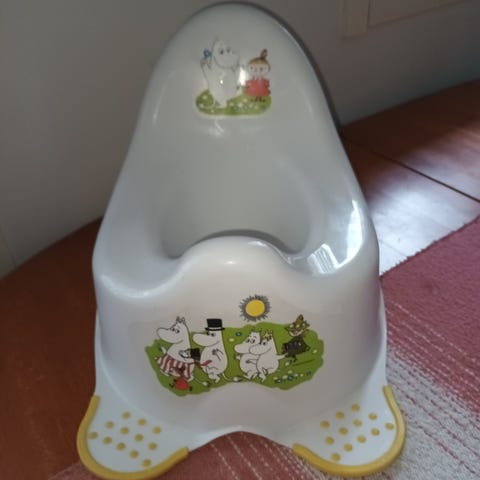 Muumi lasten potta. Valkoinen muovinen potta, jossa Muumi-hahmojen kuvitus sivuilla ja selkänojassa. Pienille lapsille tarkoitettu potta, jossa korotettu selkänoja ja tukea antavat sivuosat. Soveltuu sisäkäyttöön lapsen kuivaksi opetteluun.