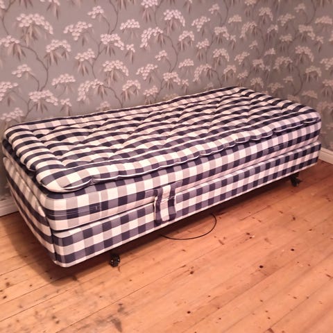 Hästens moottorisänky sinivalkoisella ruudullisella verhoilulla. Sängyssä on säädettävä pää- ja jalkopääty, joita ohjataan mukana olevalla kaukosäätimellä. Kuvissa näkyy käyttöohjeita ja kaukosäädin. Moottorisänky soveltuu yhdelle nukkujalle ja tarjoaa mahdollisuuden säätää nukkuma-asentoa esimerkiksi lepäämiseen, lukemiseen tai television katseluun. Verhoilu on perinteistä Hästensin ruutukuosia.