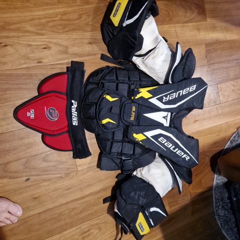 Bauer jääkiekkomaalivahdin rintapanssari harmaana. Koko L. Käytetty, mutta ehjä ja hyvä kunto