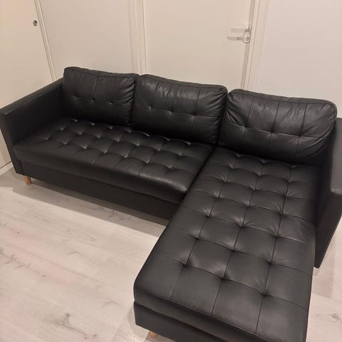 Kotimainen iso musta nahkakulmasohva divaanilla. Mitat löytyy kuvasta. Myydän muuton vuoksi. Otetaan myös tarjouksia vastaan.