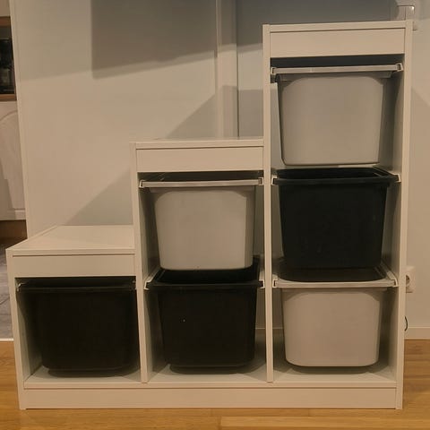 Myydään ikean trofast laatikosto. Pienet laatikot ehjät. Isot laatikot kuluneita, koska lapset istunu niissä. Runko hyvässä kunnossa.