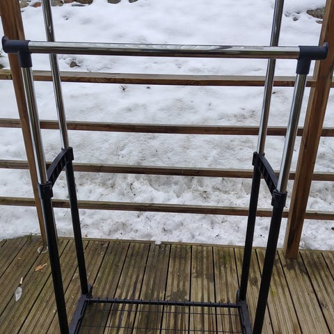 Taitettava vaaterekki. Lukittavat pyörät. Mitat avattuna. Pituus 90cm (jatkopalat 150cm), korkeus 150cm leveys 60cm.