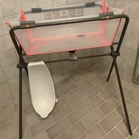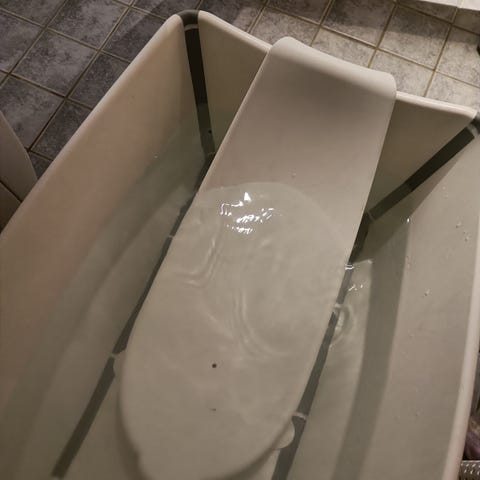 Stokke Flexi Bath vauvan kylpyamme. Taitettava muovinen amme, jonka väri on valkoinen harmailla vahvikeosilla. Pohjassa on kumitulppainen tyhjennysaukko veden poistamista varten. Amme soveltuu vauvojen ja pienten lasten kylvettämiseen. Taittomekanismin ansiosta amme vie vähän tilaa säilytyksessä ja on helppo ottaa mukaan matkalle tai käyttää pienissä tiloissa, kuten kylpyhuoneessa tai suihkutilassa.