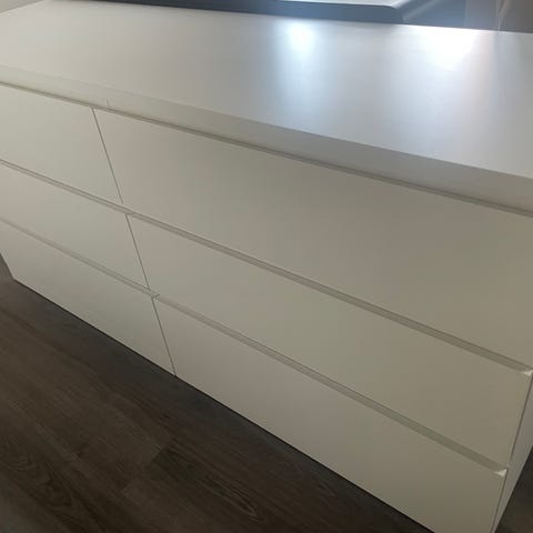 IKEAn valkoiset lipastot, jossa useita vetolaatikoita säilytykseen. (Toisessa 6 laatikkoa ja toisessa 4)