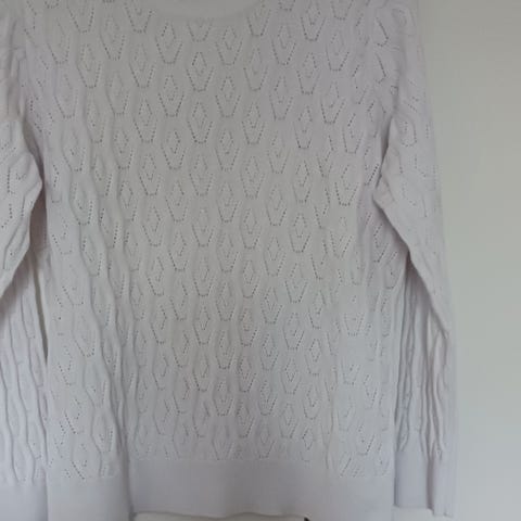 Suomessa valmistettu valkoinen puuvillaneule. Sekä etu-että takakappaleessa ankkurikuvio ja olkapäällä ankkurinapit. Helman löysä resori toimii hyvin housujen tai hameen päällä.