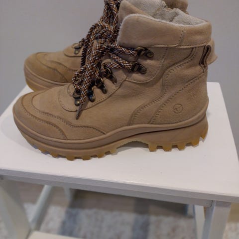 Tamaris talvikengät, koko 39. Nauhalliset tiilinpunaiset nilkkurit vetoketjulla ja pienellä korolla, erittäin siistikuntoiset. Sisällä synteettinen pörröinen vuori, päälliskangas mokkanahkaa.
