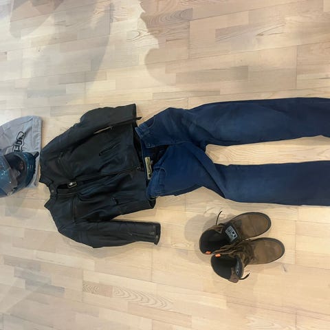 Allthecross avokypärä ja nahkainen HELD ajopuku moottoripyöräkäyttöön. Kypäbahrä on musta, siinä on suuret Allthecross-logopainatukset ja mukana irrotettavat suojalasit. Ajopukuun kuuluu musta nahkatakki ja mustat nahkahousut polvisuojilla. Puku on tarkoitettu moottoripyöräilyyn ja muuhun moottoriajoneuvoilla ajamiseen, tarjoten perussuojaa ja tuulensuojaa nahkamateriaalin ansiosta. Hintansa väärti aivan varmasti et kokenut mukavampaa motskaripukua, joka pitää viiman ja veden poissa oikein käsiteltynä.