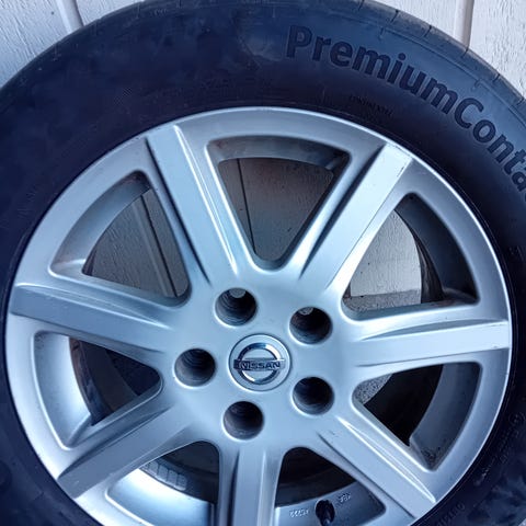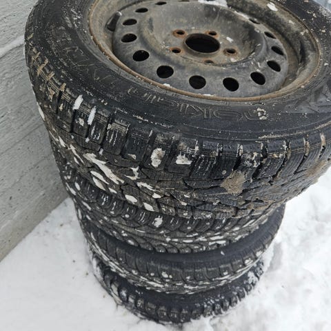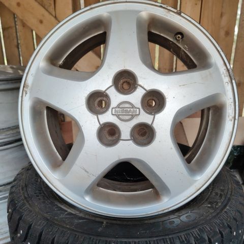 Nissan peltivanne 15"4x114,3 päällä hyvin pintaa oleva talvirengas.