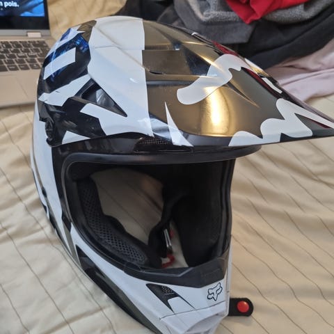 Fox kypärä. Väri punainen mustilla ja valkoisilla yksityiskohdilla. Soveltuu esimerkiksi pyöräilyyn tai moottoriurheiluun, kun koko ja käyttötarkoitus tarkennetaan erikseen. 60€