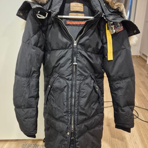 Parajumpers takki naisille, koko S. Musta, pitkä malli, jossa tikattu rakenne ja nailonkangas. Takissa on lämmin toppaus sekä huppu, jossa turkis. Edessä vetoketju ja painonappikiinnitys sekä taskut. Soveltuu kylmiin talviolosuhteisiin arkikäyttöön ja vähän hienompaankin.