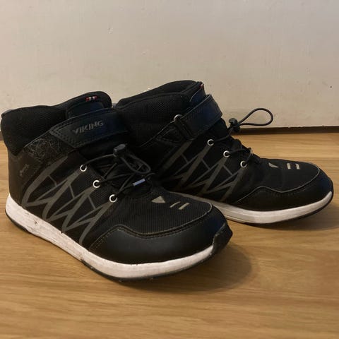 Myydään mustat Viking goretex välikausikengät, koko 37. Siistit ja ehjät, toisen kengän kärjessä rispaumaa, jonka päälle laitettu tekstiilitarra. Lemmikitön savuton talous.