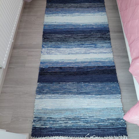 Räsymatto- käytävämatto, ehjä ja puhdas. Pitkän mallinen matto, jossa sinisen ja ruskean sävyisiä raitoja ja vaalea hapsureuna. Sopii käytävään, eteiseen tai muuhun kapeaan tilaan. Materiaali puuvilla kudelma. Värit ja kuviointi näkyvät tarkemmin kuvista.