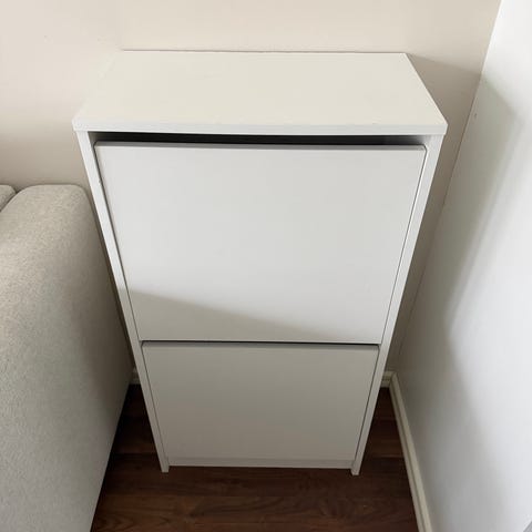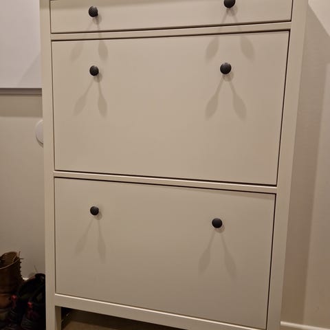 Ikean Brusali kenkäkaappi. Kaappi on vanhempaa mallia puukuvioidulla pinnalla. Vetimet vaihdettu alkuperäisistä toisiin. Välijakajat puuttuu lokeroista. Avohyllyn tason etureunassa kulumaa, muuten ehjä ja hyväkuntoinen.