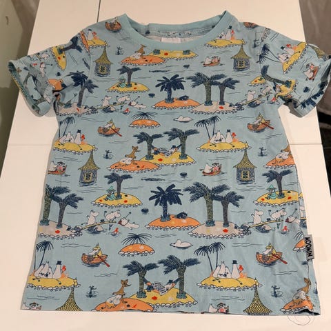 Moomin, lasten t-paita, koko 116. Unisex-mallinen t-paita, jossa on monivärinen, kirjava kuosi. Materiaalina puuvilla. Sopii arki- ja vapaa-ajan käyttöön lapsille, joiden vaatekoko on noin 116 cm.
