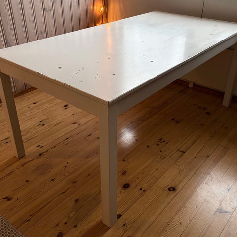 Pöytälevyn lakkapinta paikoitellen kulunut/ mennyt kuuman ruokalautasen lämmöstä pilalle. Hionta ja uusi käsittely korjaa tilanteen. Tai liina päälle.